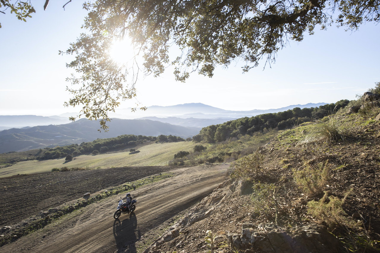 We trokken naar het Andalusische binnenland om gedurende twee dagen de motoren aan de tand te voelen. Op dag één gingen we offroaden met de Rally Pro, waarna op dag 2 een rechtstreeks vergelijk tussen de GT Pro en de Rally Pro op de openbare weg stond gepland. De GT wordt in de Benelux niet ingevoerd – en tekende bijgevolg niet present in Spanje. Voor die tests reden we dwars door de Zuid-Spaanse heuvels, over vaak glooiende en soms steile hellingen die je honderden kilometers door de bergen voeren. Met spectaculaire vergezichten en een winterzonnetje dat de temperatuur tot 25 graden doet klimmen. Het kon erger.