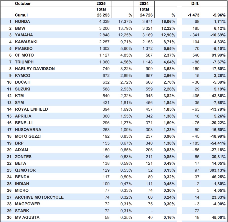 Na tien maanden klokt de markt af op 23.253 nieuw ingeschreven motorfietsen, scooters, driewielers en lichte vierwielers, een daling van -6% tegenover 2024.