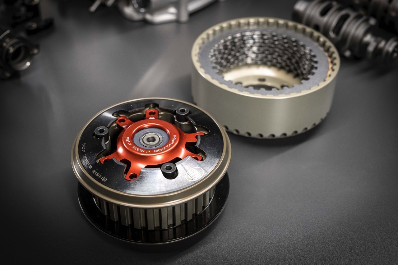 Een knap staaltje racetechnologie zit diep in het blok verscholen. Ducati heeft z’n nieuwe V4 immers uitgerust met z’n Ducati Racing Gearbox, waarbij het schakelpatroon grondig is aangepast: in plaats van een 1-N-2-3-4-5-6-patroon, heeft het merk nu voor een N-1-2-3-4-5-6-volgorde gekozen. Een prima keuze voor al wie vaak op het circuit vertoeft. En extra handig voor het bijbehorende snufje: de Ducati Neutral Lock, die voorkomt dat je per abuis in neutraal terechtkomt. Op de schakelwals is immers een extra nok voorzien die de schakeltrommel mechanisch kan blokkeren, als je een hendel op de rechter stuurhelft vastzet. Op zich eenvoudig qua idee, briljant qua uitwerking – en binnenkort te testen op de nagelnieuwe 2026 Panigale V4 R!