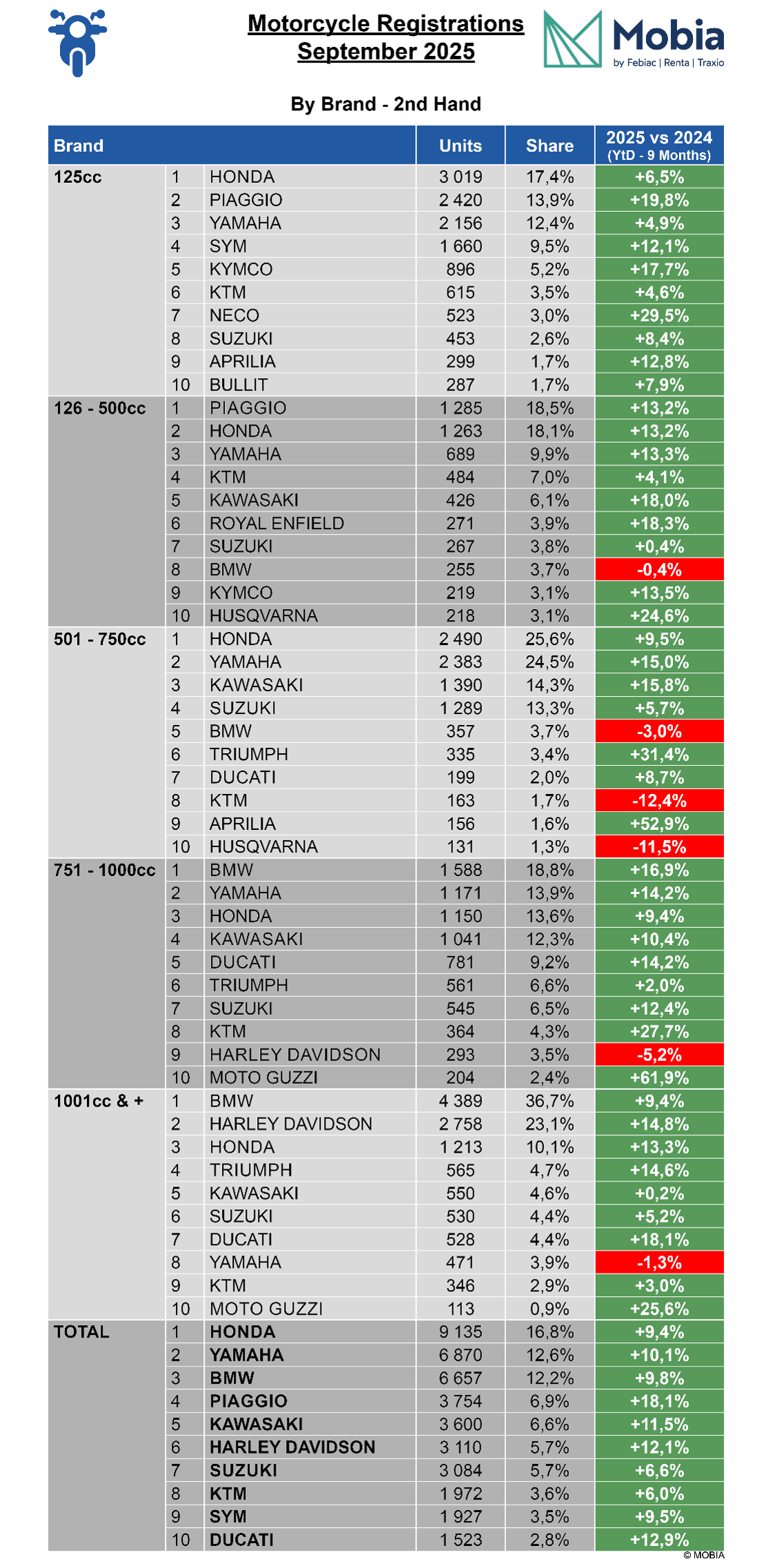 Bij de merken blijft Honda marktleider (3.825 inschrijvingen, marktaandeel 17,6%). BMW volgt op een afstand (2.999 eenheden) terwijl Yamaha lijdt onder moeilijke leveringen van de nieuwkomers (2.639 stuks) maar blijft voor een sterk presterend Kawasaki blijft. Opvallende dalers zijn KTM-Husqvarna-GasGas en Harley-Davidson. CF Moto van zijn kant stijgt maar liefst +90,9%, bijna een verdubbeling ten opzichte van vorig jaar dus, en staat als eerste Chinees merk al op de zesde plaats in het klassement. Ook QJ Motor is aan een sterke opmars bezig (+412,5%) maar blijft in absolute aantallen nog een pak achter op CF Moto. Toch is het een teken aan de wand dat de Chinese merken bezig zijn aan een sterke opmars.